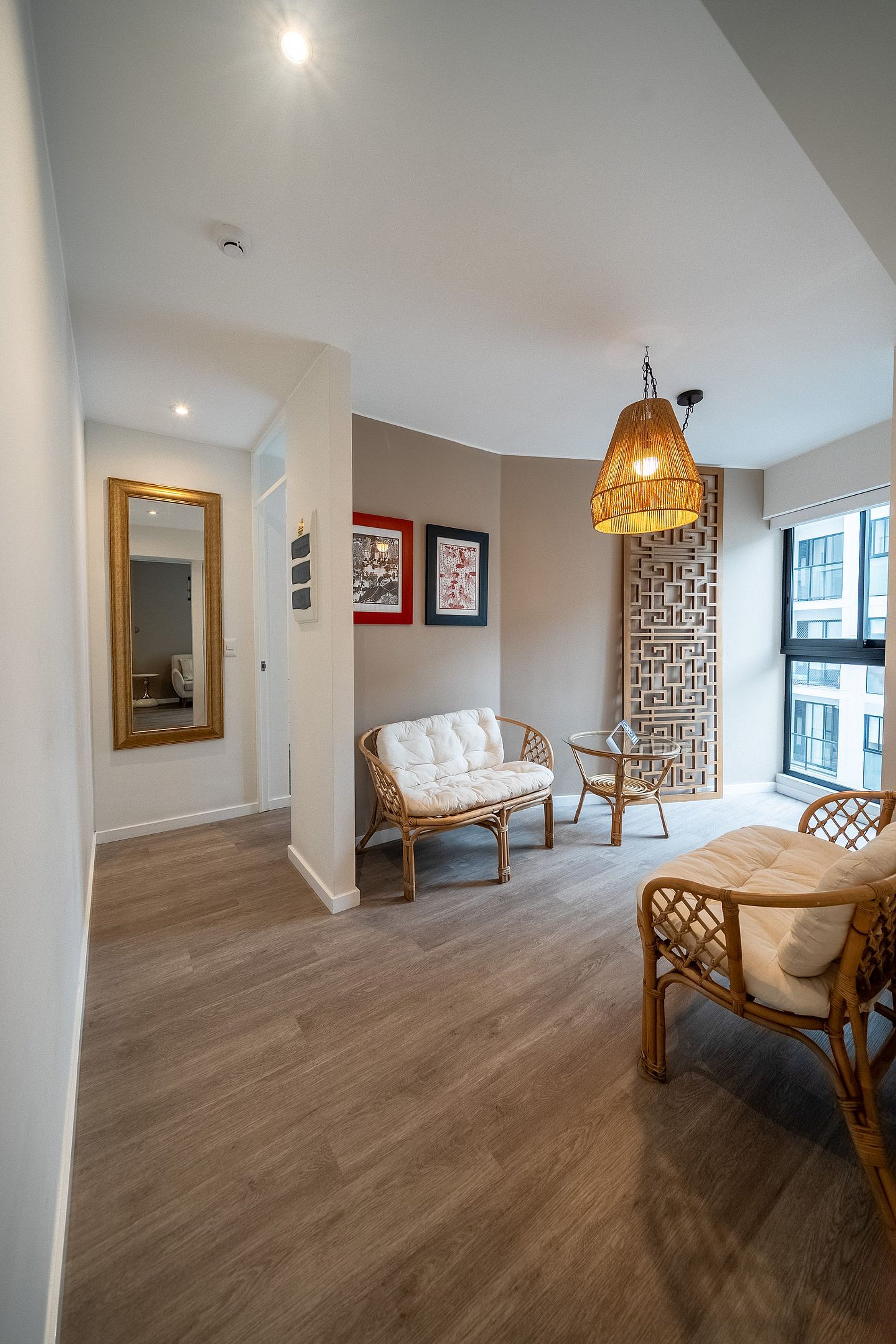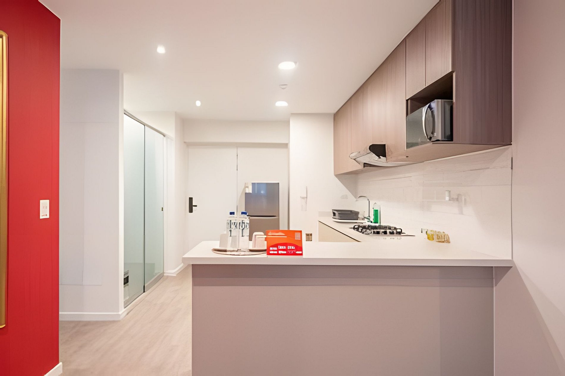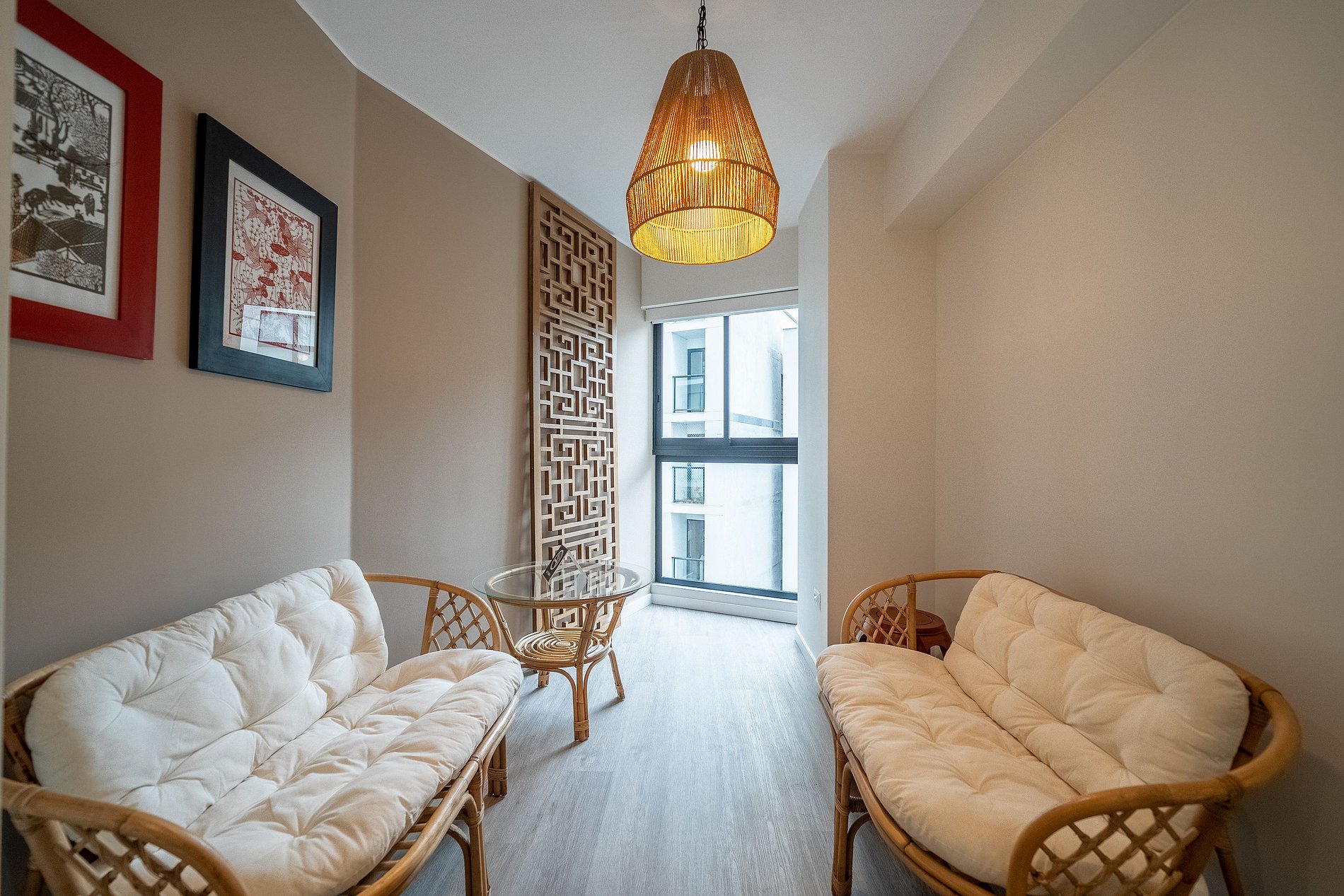 El departamento es amplio. Ideal para familias pequeñas o 4 personas. El departamento tiene colores rojos y un diseño chino moderno. Cuenta con una amplia cocina totalmente equipada. La Sala con Smart TV, Wifi Alta Velocidad y sofá. El espacio de comedor está en otro ambiente separado para mayor privacidad. La Habitación Principal cuenta con una cama queen y un baño privado. La Habitación Secundaria con 2 camas de 1 plaza y media con clóset. Baño Secundario con ducha y agua caliente. También el departamento cuenta con lavadora. El edificio cuenta con áreas comunes que tienen costo adicional sujetas a disponibilidad.