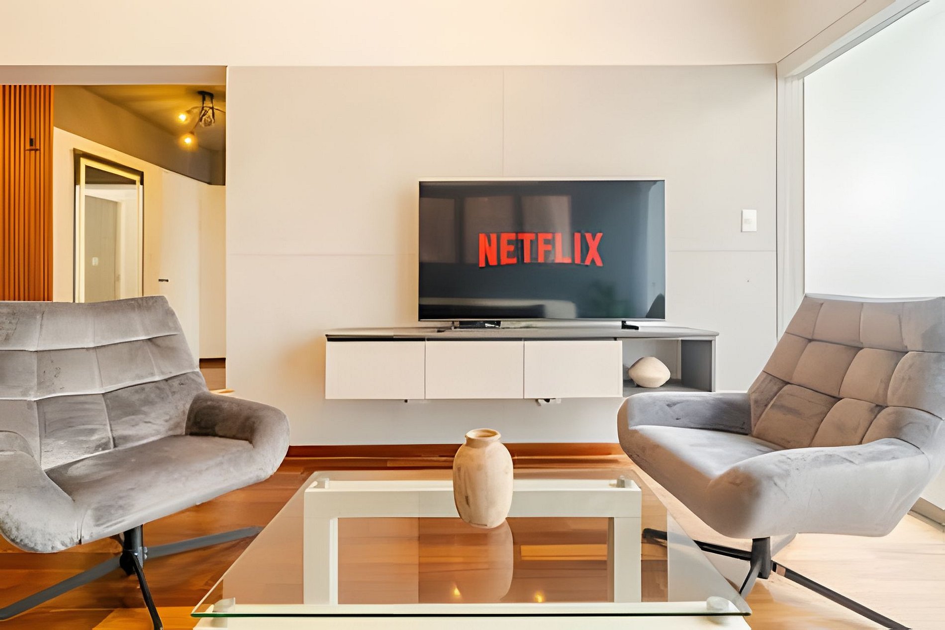 Al ingresar, te recibirá un elegante espejo con luz LED y un pequeño sofá. La sala cuenta con un cómodo sillón, televisor, un balcón para disfrutar del aire fresco y Wi-Fi de alta velocidad para trabajar o relajarte. La cocina es amplia y totalmente equipada con todo lo necesario para tu estadía, incluyendo un lavaplatos. También encontrarás un espacio de lavandería con lavaseca, además de un baño completo adicional. La habitación principal incluye una cama Queen, clóset y baño privado. La segunda habitación cuenta con una cama de dos plazas, clóset, TV y un escritorio ideal para trabajar o estudiar. La tercera habitación ofrece una cama de dos plazas con un colchón adicional de plaza y media debajo, clóset y un segundo escritorio de trabajo.